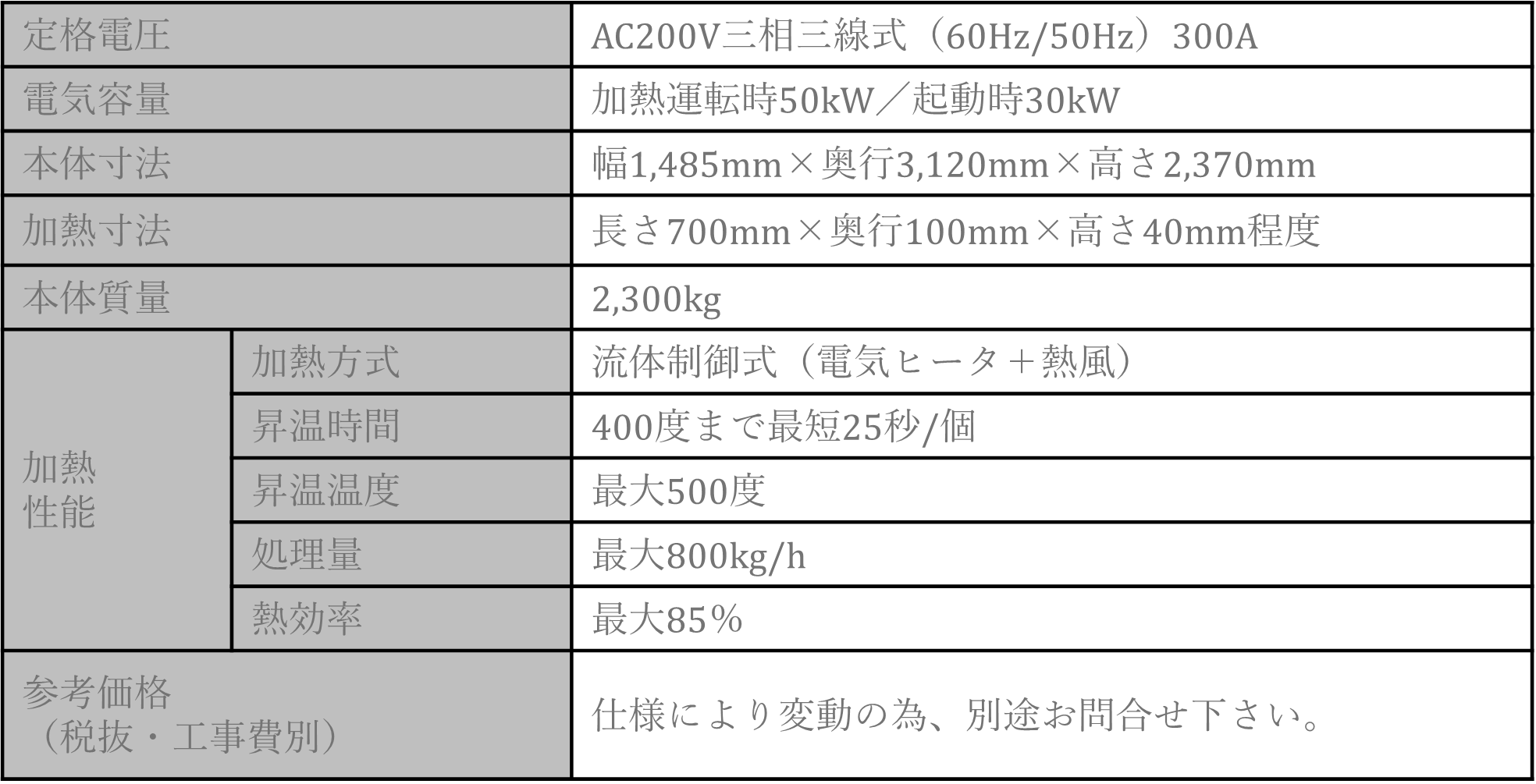 • 熱効率は、バーナーを熱源とした熱風による加熱方式の20~50%を大幅に更新し最大85%を達成します。