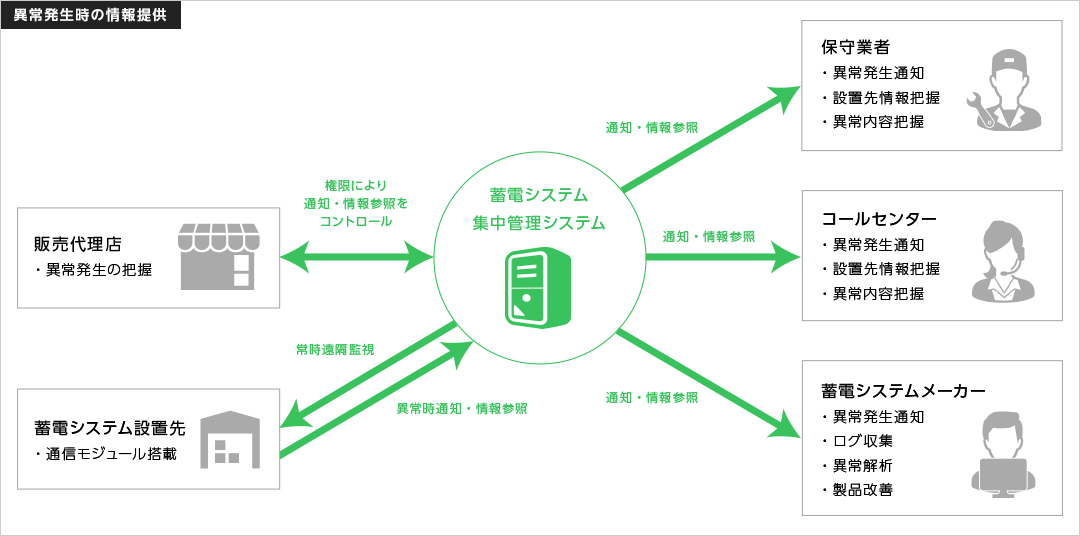 設置済みのリチウムイオン蓄電システムの遠隔監視を可能にします。通常、システムに異常が発生した場合は管理業者のコールセンターへ連絡が行き、そこから保守業者・蓄電システムメーカーに情報が共有されるという流れになりますが、蓄電システムに集中管理システムを導入することによって、異常発生時に保守業者・蓄電システムメーカーへ即座に情報が提供され、対応への迅速化・効率化に貢献します。
