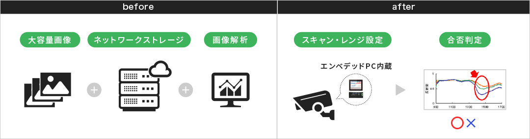 自動化が進んでいない検査工程の合否判定を、PC組込みカメラを採用し、実現します。従来のシステムは重い画像データを運用し、大掛かりで高コストですが、豊電子は独自のロジック判定のシンプルなシステムを提案します。