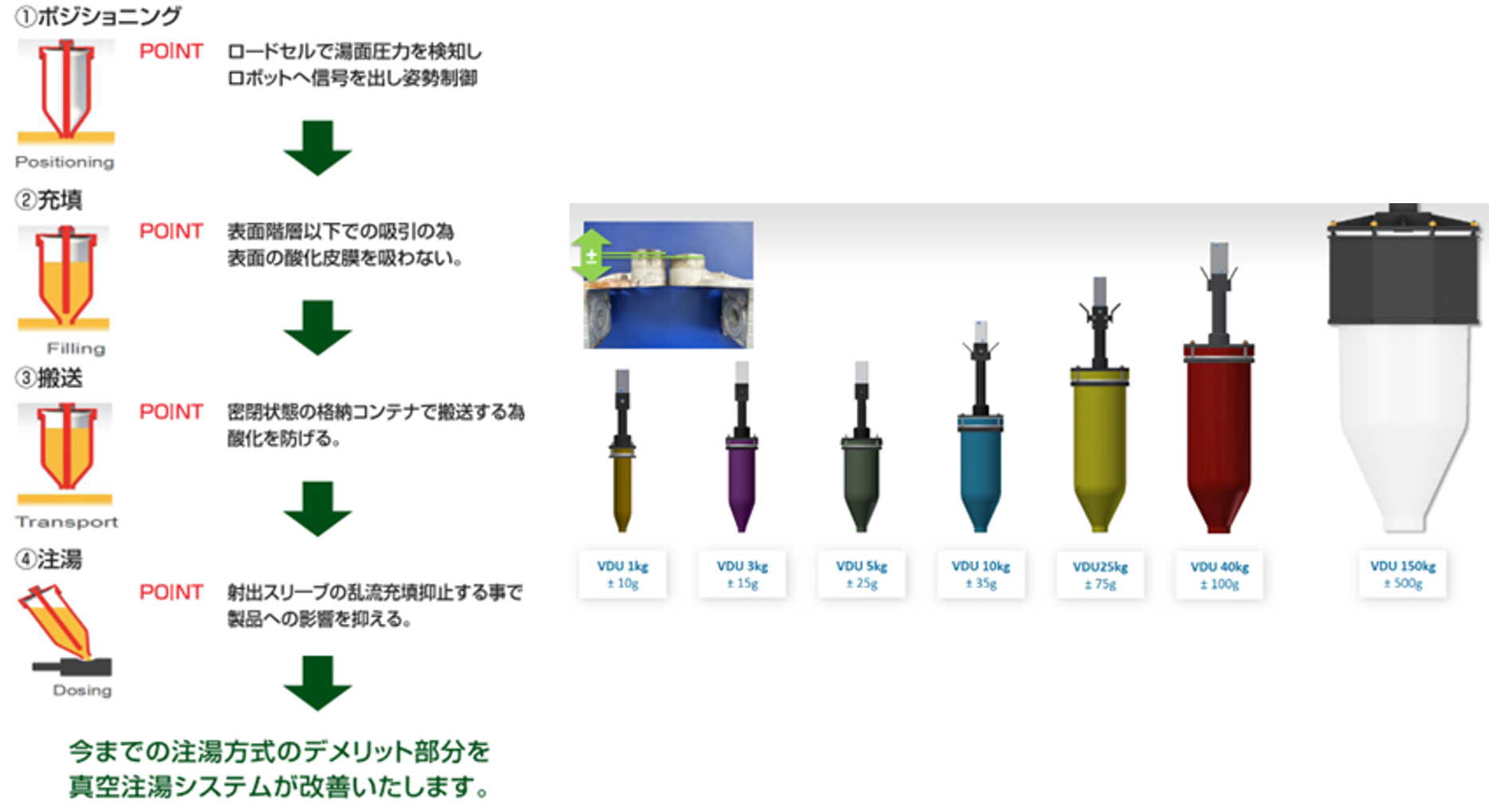 AVDシステムでは、注湯ハンドへ搭載されたロードセルで湯面圧力を検知し、充填することで、高い注湯精度や繰返し精度を実現する事が可能です。また、保持炉内の表面層以下より溶湯を吸い上げる事により、酸化被膜の吸い上げを防止する事が可能です。密閉されたセラミック容器で搬送する事で溶湯の温度低下や酸化を防止する事が可能です。